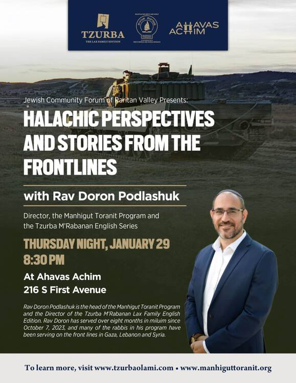 Halachic Perspectives and Stories from the Frontlines Thursday, January 29, 2026 8:00 PM 9:00 PM 20:00 21:00 Congregation Ahavas Achim 216 South 1st Avenue Highland Park, NJ, 08904 United States (map) Google Calendar ICS
