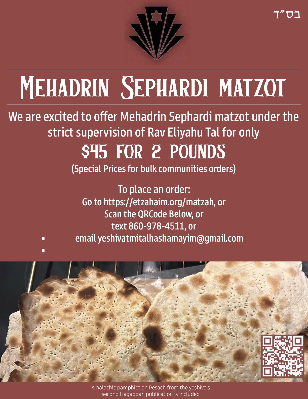 Order Your Mehadrin Sephardi Matzot — Price Drop March 20, 2026 Click Here to Preorder Matzot Payment is due when you pick up your orders. Pay with cash, check, or credit card.